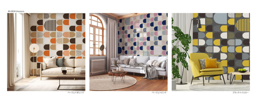 ランダム感のあるパターンと、楽しげなカラーの北欧風壁紙デザインです。
