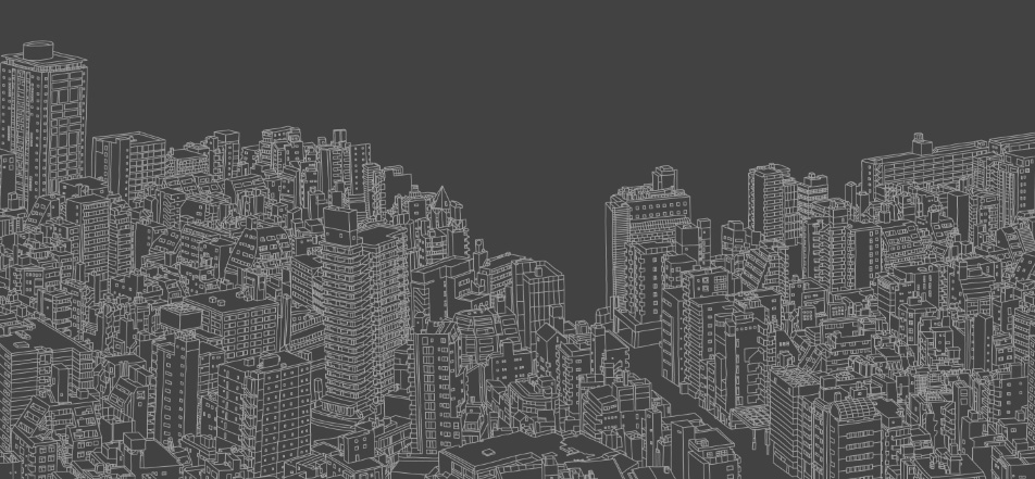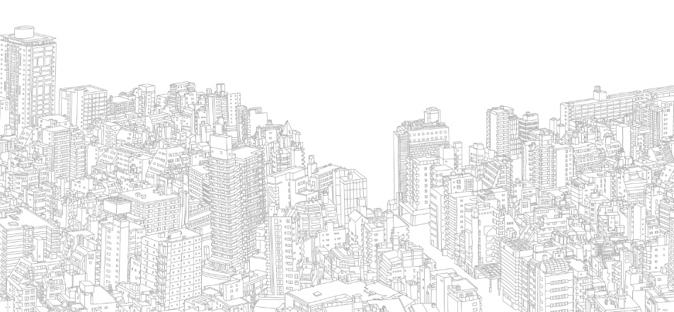 高い所から眺めた現代の街並み。ビルやマンション達の硬いイメージとミニチュアのような手描きの優しいラインが絶妙な一枚。ひと味違う空間を生み出してくれることでしょう。横リピートが可能で広いガラス面に対応が出来ます。