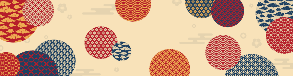 和風でいて日本古来の文様を円の中に散りばめた輪モダンスタイルのデザイン。 空間に華やかさ、可愛らしさを取り入れたいときにお使いください。 横方向へのリピート可能。