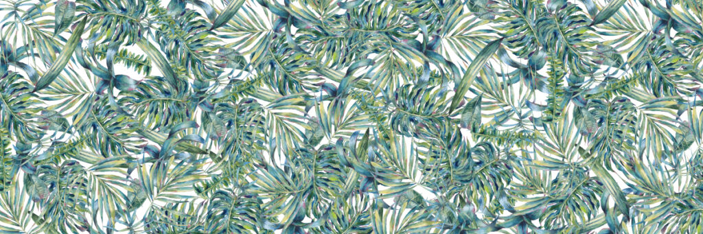 熱帯の葉っぱのイラストをいっぱい敷き詰めたデザインです。 癒しと非日常感。緑に溢れる空間でお部屋を鮮やかにコーディネートしてみませんか?