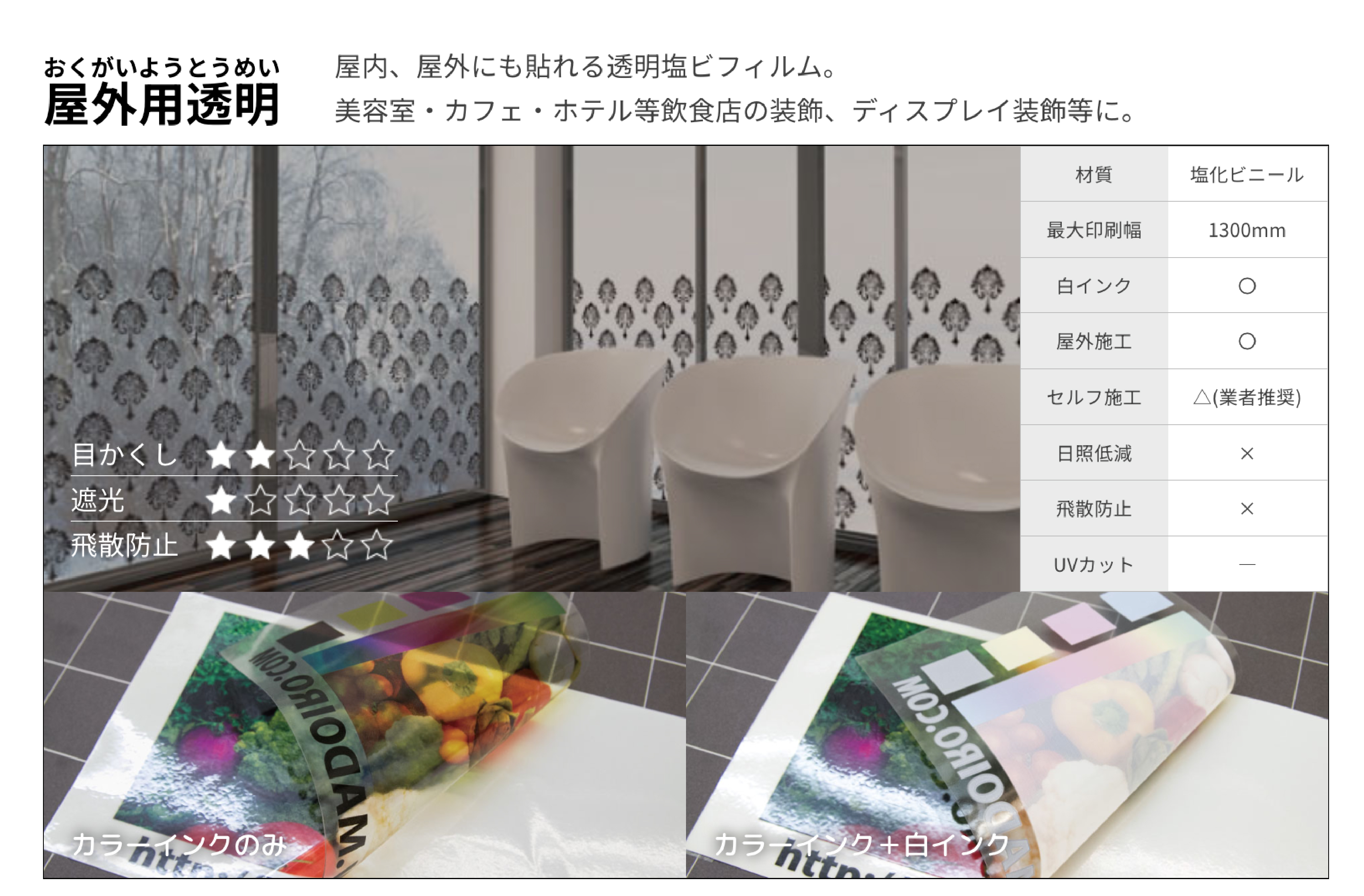 屋内・屋外問わず貼り付け施工が可能なクリア系塩ビフィルムです。