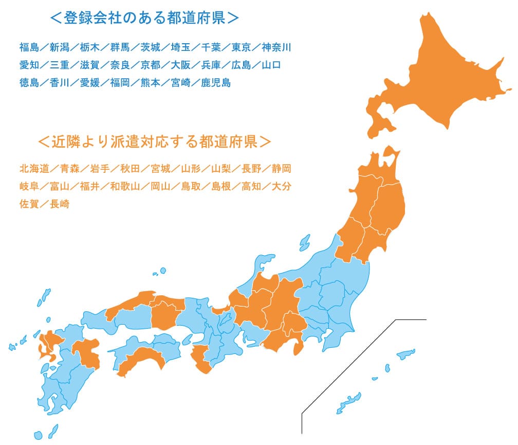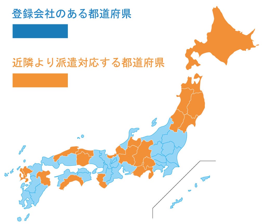 上記窓口へお問い合わせください。全国対応可能ですが、都道府県により登録会社(職人)の有無があるため、該当エリアの場合は近隣より派遣という形になります。あらかじめご了承ください。